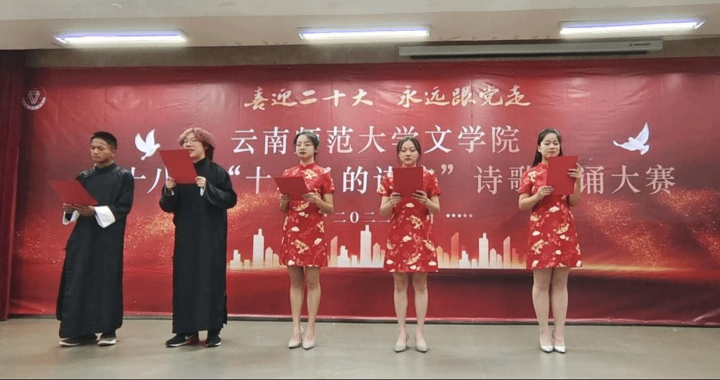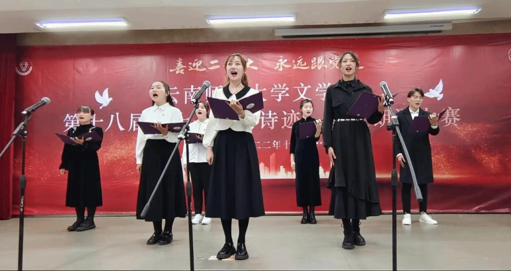 热情讴歌党的百年奋斗,真挚祝福祖国繁荣富强。10月20日晚,365英国上市官网文学院第十八届“十一月的诗迹”诗歌朗诵大赛在明德三号楼111报告厅举行。共有本科生及研究生18支队伍参与角逐。文学院党委副书记石安银,辅导员苏俊、李艳红、杨慧芹、傅琳钧、王英健、周昱辰七位老师担任评委。