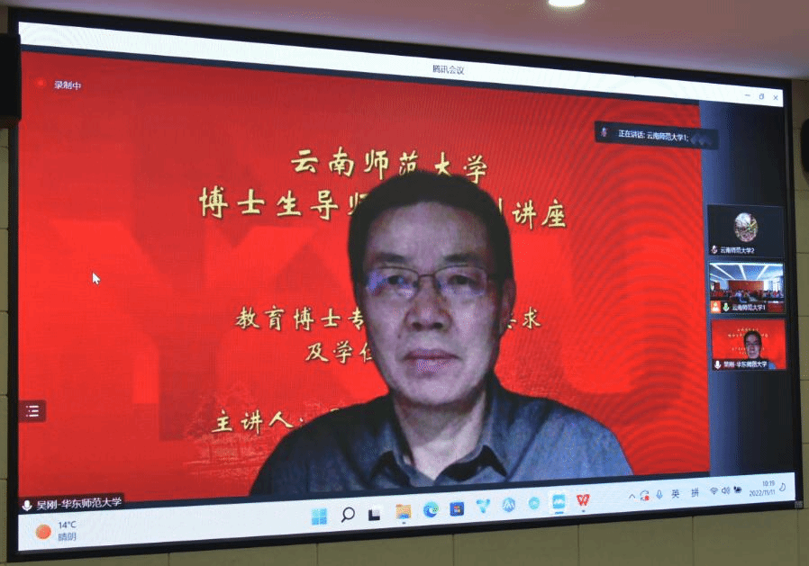 为深入贯彻落实全国研究生教育大会精神,加强教育博士专业学位指导教师(以下简称“教育专博指导教师”)队伍建设,提升教育专博指导教师的指导能力和水平,全面提高学校教育博士研究生的培养质量,11月11日上午,我校在呈贡主校区行政楼340会议室举办365英国上市官网博士生导师培训系列讲座第二讲——教育博士专业学位培养过程及学位论文基本要求分析。全校教育专博指导教师、教育专博研究生近100人集中收看华东师范大学教育高等研究院副院长、全国教育博士专业学位研究生教育专家工作组成员吴刚教授作的线上专题讲座。讲座由研究生院副院长罗利佳主持。