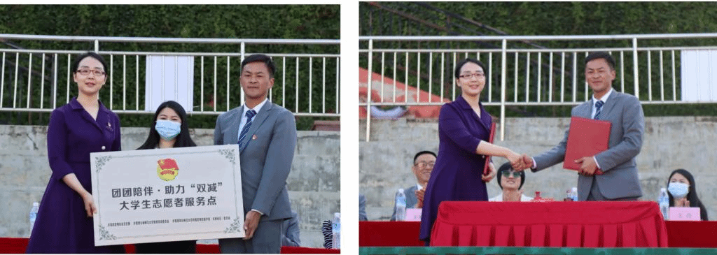 同时,为进一步发挥好党建带团建工作优势,助力“双减”“心理健康工作”双推进、双融合,呈贡区团委副书记王丹向教育学部和四川师范大学附属昆明实验学校(天娇校区)“团团陪伴·助力双减”大学生志愿服务点授牌。教育学部团委副书记闫晓飞和四川师范大学附属昆明实验学校(天娇校区)团委书记左明鑫代表双方签订团建合作协议。