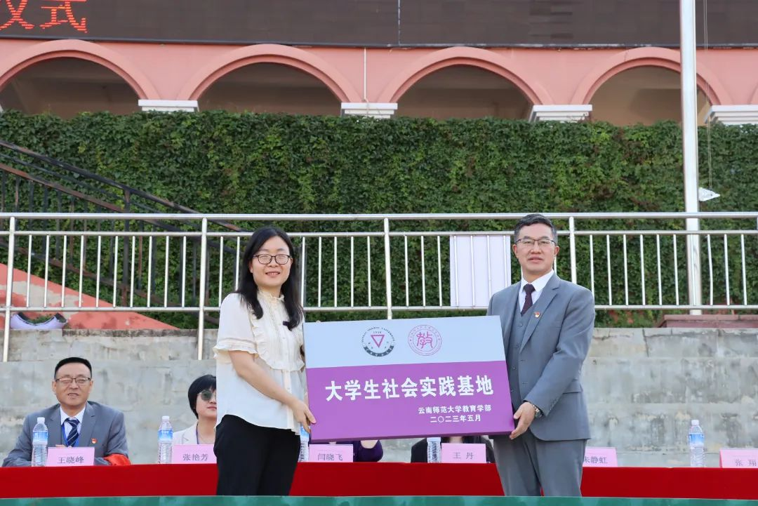 5月22日,两单位举行大学生社会实践基地授牌仪式暨“团团共建,助力双减”的团团结对签约仪式。教育学部党委副书记朱静虹向四川师范大学附属昆明实验学校(天娇校区)进行授牌。