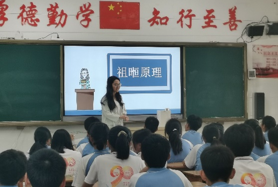 27日,施子月同学对银生中学40余名初一学生开展题为《莫比乌斯带》的科普讲座。施子月同学通过创设蚂蚁吃食物的问题情景,带领同学们从动手操作和理论分析层面展开科普活动,向同学们拓展了莫比乌斯带的妙用,进一步培养学生用数学的眼光观察世界。王喆同学以《祖暅原理》对银生中学40余名初一学生开展科普讲座活动,在此之中得到了同课异构的宝贵经验。