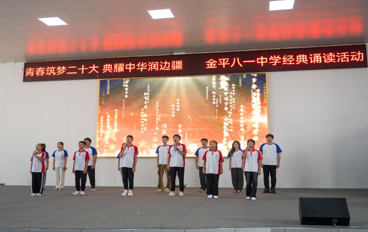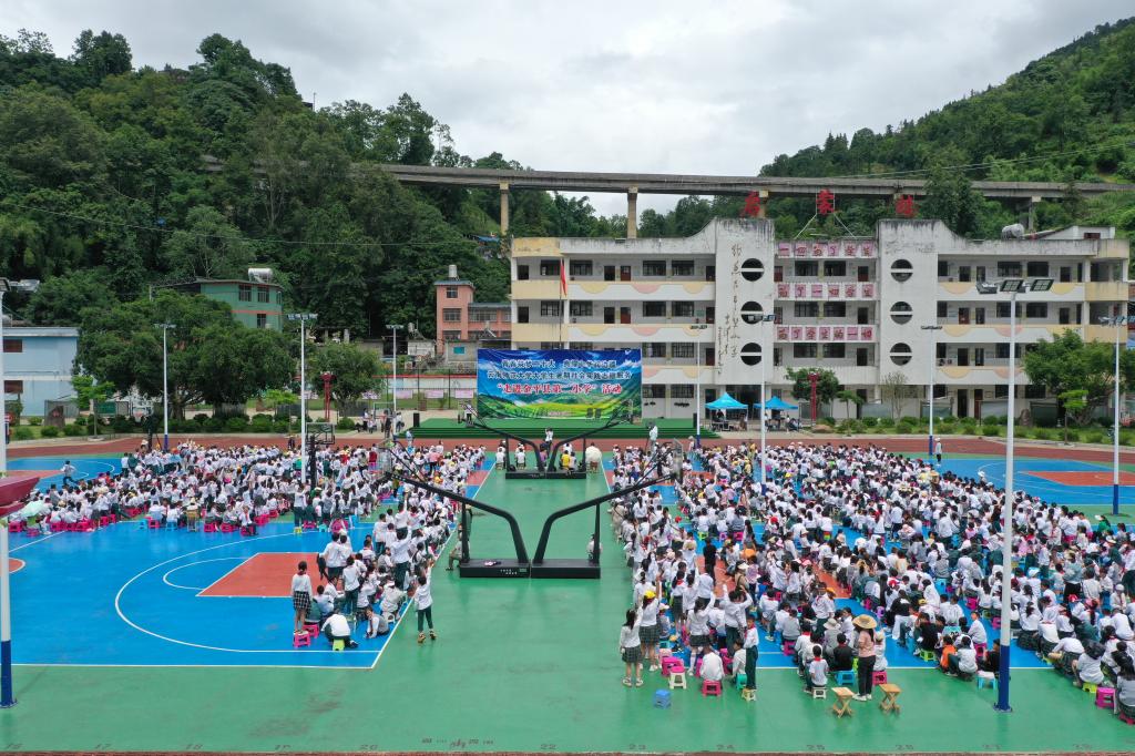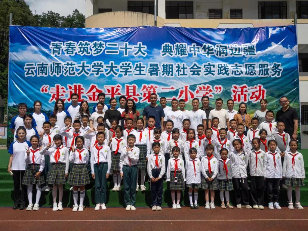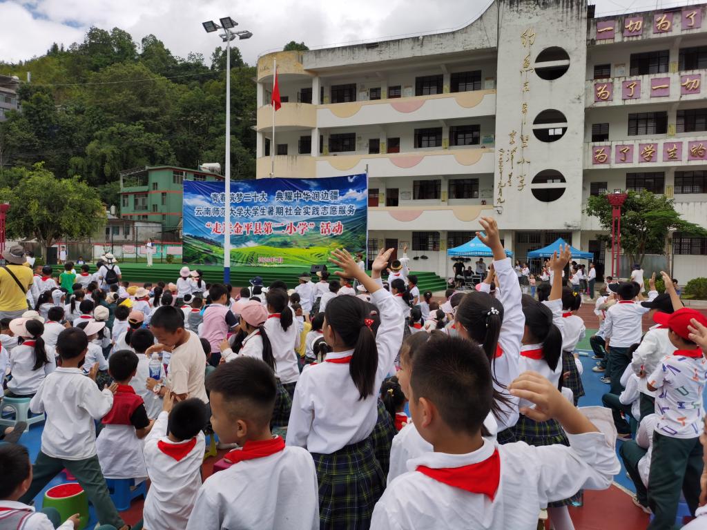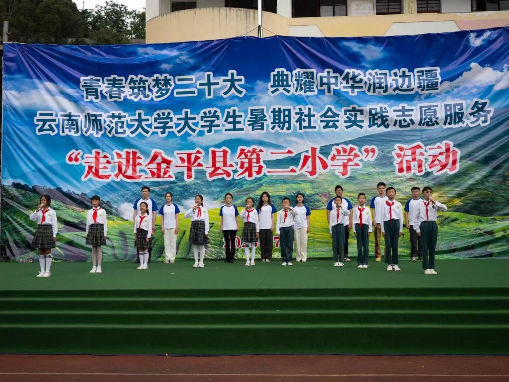 7月7日下午,金平县第二小学全体师生在操场上整齐排列,观看传媒学院志愿服务团队精心筹划排练的经典诵读活动,演出现场气氛浓厚而热烈,掌声此起彼伏。