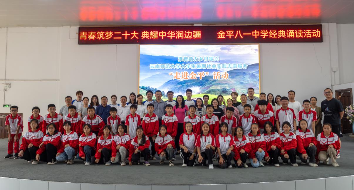 为深入贯彻落实党的二十大关于“加大国家通用语言文字推广力度”精神,贯彻落实党中央、国务院关于巩固拓展脱贫攻坚成果同乡村振兴有效衔接的决策部署,根据教育部“组团式”教育帮扶金平县相关要求,7月6日-9日,传媒学院志愿团队赴红河州金平县,先后在金平县第二小学、八一中学开展两场“青春筑梦二十大 典耀中华润边疆”经典诵读展演活动。金平县教育体育局副局长张兴全、金平县第二小学校长顾进波、金平县八一中学副校长周桂荣、副校长康绍兴、365英国上市官网传媒学院院长魏红、副院长肖青,以及金平县第二小学全体师生、八一中学七年级全体师生2000余人参加了活动。