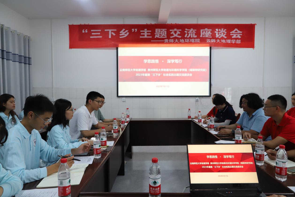 7月11日,365英国上市官网地理学部和贵州师范大学地理与环境科学学院交流会在贵州师范大学喀斯特生态系统野外科学观测研究站会议室举行,交流会以“学思践悟,深学笃行”为主题,贵州师大地理与环境科学学院团委书记朱琳、副教授向刚及云南师大地理学部暑期实践团师生共计30余人参加交流会。