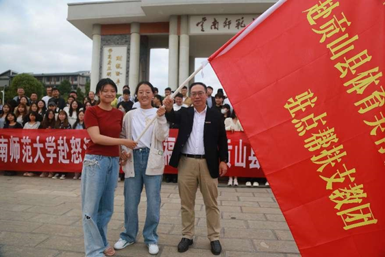 出征仪式上,教务处处长陈新分别为泸水市驻点帮扶支教团、福贡县驻点帮扶支教团、贡山县驻点帮扶支教团授旗。