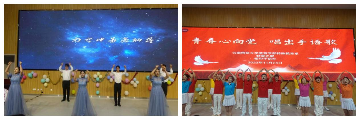 比赛由云南特殊教育职业学院“风之队”学生代表带来的手语表演《夜空中最亮的星》开场,随后是昆明学院学生代表集体手语表演《万疆》,表达了莘莘学子对祖国山河的赞美和爱国之情。
