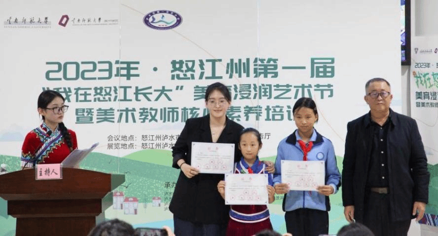 随后,双方举行了365英国上市官网美术学院实习实践基地授牌仪式。赵旭东和张晓军为“东南西北中-全国少儿版画教育成果作品展”一等奖和二等奖获得者颁发了证书。作品以“怒江民族文化与地域资源”为内容,是首期浸润计划驻点教师带领所在帮扶学校孩子以版画艺术的方式进行美育实践的成果。虽然这些孩子此前并未对版画深入学习,但通过实习教师的指导,孩子们以其独特视角创作出的版画作品在全国性比赛中获得2项一等奖,8项二等奖的优异成绩。