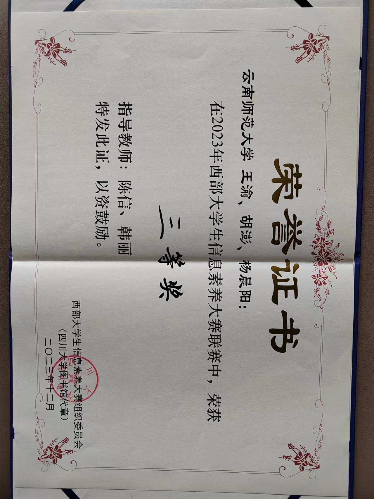 近日,在四川大学举行的2023年西部大学生信息素养大赛决赛中,我校“望岳队”(由物理与电子信息学院王渝、信息学院胡澎和地理学部杨晨阳三位同学组成,指导老师为陈信、韩丽)获得三等奖。在此前举行的云南省决赛中,我校学生在此项赛事中亦获得9个奖项,其中获得特等奖的“望岳队”表现优异,成为代表云南省参加西部大学生信息素养大赛最终决赛的2支队伍之一。