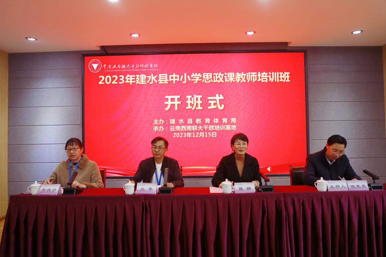 12月15日上午,由建水县教育体育局主办,我校西南联大干部培训基地承办的2023年建水县中小学思政课教师培训班在一二一联大校区开班。建水县教育体育局职成教科科长兰苇出席开班式并作动员讲话,西南联大干部培训基地执行主任匡锦在开班式上致辞。建水县教师进修学校苏良芬副校长、建水县中小学思政课骨干教师等77人参加培训。开班式由西南联大干部培训基地执行副主任铁发宪主持。