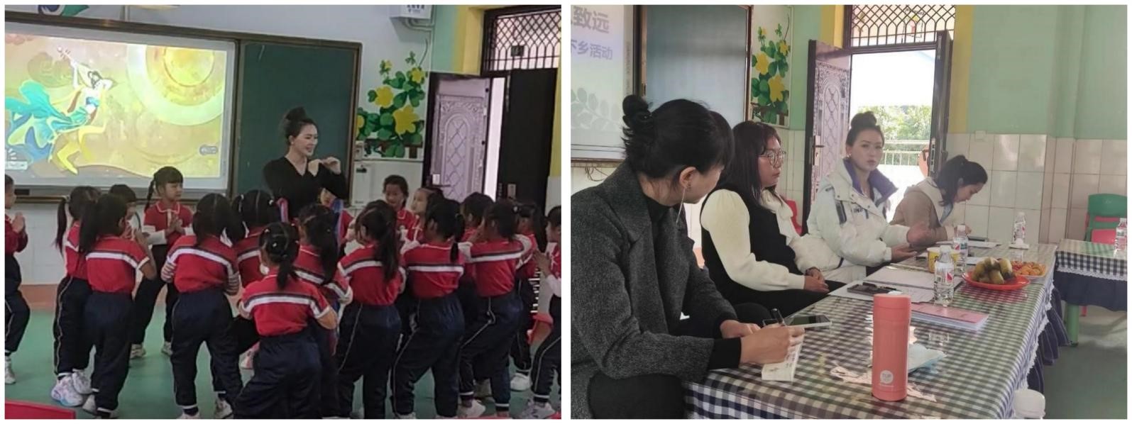 12月16日上午,颜尔雅在晓街乡月牙幼儿园进行大班艺术活动《飞天神韵》公开课分享。课后,傅媛蕾和颜尔雅就如何将中华传统文化融入幼儿园艺术活动进行指导,并针对幼儿园艺术活动中存在的问题及时进行诊断和指导。下午,傅媛蕾组织送教活动总结会。王金枝指出,本次送教团队为晓街乡的幼儿教师进行了以语言、艺术两个领域的优质课展示,教师们富有童趣、游戏化的活动课,唤起了幼儿极大兴趣。