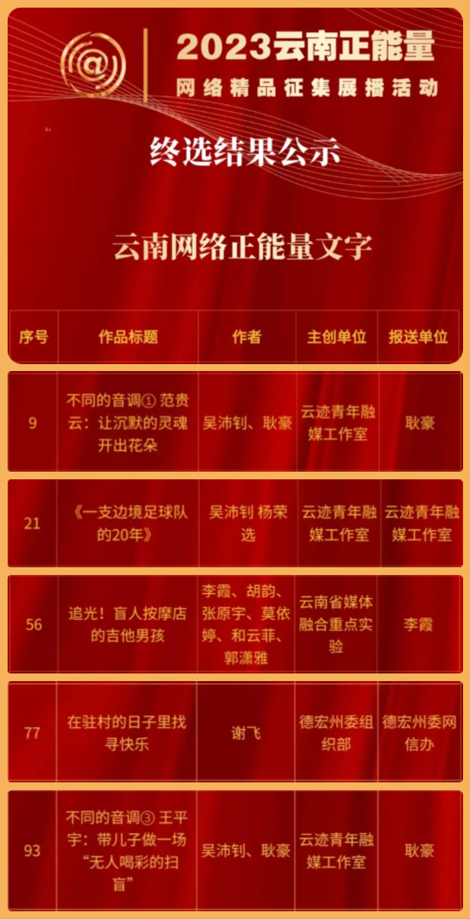 其中,我校传媒学院学生参与、云报集团“云迹”融媒实验室推送的作品《不同的音调①范贵云:让沉默的灵魂开出花朵》(作者:吴沛钊、耿豪)入选“十佳精品”,《不同的音调③王平宇:带儿子做一场“无人喝彩的扫盲”》(作者:吴沛钊、耿豪)、《一支边境足球队的20年》(作者:吴沛钊、杨荣选)、《追光!盲人按摩店的吉他男孩》(作者:李霞、胡韵、张原宇、莫依婷、和云菲、郭潇雅)获评“2023云南网络正能量文字”,传媒学院老师谢飞所写、德宏州网信办推送的《在驻村的日子寻找快乐》同时获评“2023云南网络正能量文字”。