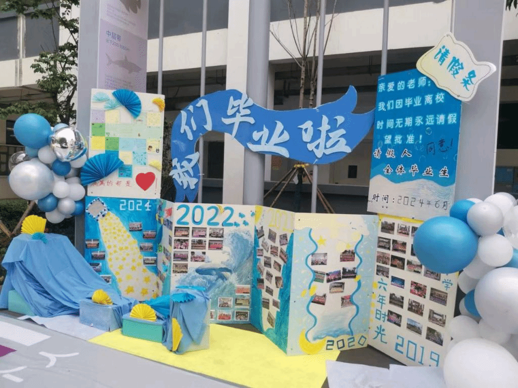 与往年不同,今年的毕业季增加了8个六年级毕业班的8个项目式学习展示。孩子们以情谊为轴组织开展了不同的毕业打卡秀项目式学习设计。六年级同学全员参与,分组合作,完成了不同区域打卡点的设计、制作、汇报。“同学墙”上有大家参加活动的照片记忆,“未来之门”寓意走向美好的明天,“心语电话亭”可以投放留言给伙伴和老师,“同学路”引领嘉宾走进会场……就连本次展演的入场券和节目单也都是同学们通过项目式学习集体呈现的成果。每一个项目,都聚集了师生们共同的智慧和汗水,都诉说着对母校的眷念和感恩。
