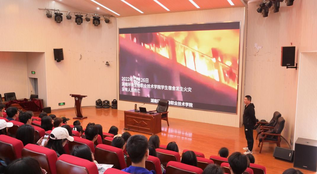 讲座中,保卫处肖潇老师借助PPT课件演示、视频观看、提问互动等形式,按照“防消结合,预防为主”的原则,以各种火灾案例向同学们介绍了火灾重在预防、小火灭火扑救、大火火场逃生等消防基本常识。他分别从宿舍、食堂、教学楼、实验室、电动车充电等火灾处置办法、灭火器使用方法、在不同火灾现场如何正确开展安全疏散与逃生的知识等内容与同学们展开交流。