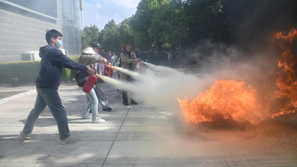 讲座结束后,相关工作人员还与同学们实地开展消防安全演练。通过介绍灭火器材分类与识别、演示器材使用方法、模拟火灾现场,亲身实践教授同学们正确处理火灾险情和使用灭火器材。