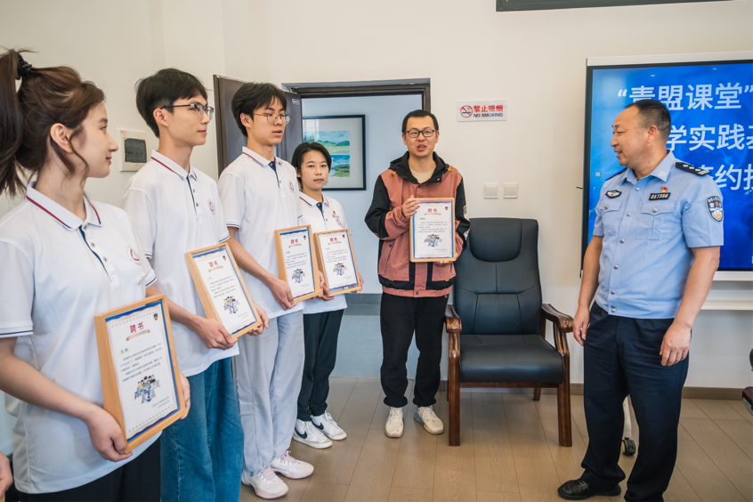 与会人员一起观看了警校双方的合作作品《走进——指挥中心马瑞松》。徐云辉和张天明共同签署了“青盟课堂”校地共建教育教学实践基地合作协议,进行“青盟课堂”牌匾的颁发仪式。李富良为12名“青盟课堂”志愿者颁发聘书。