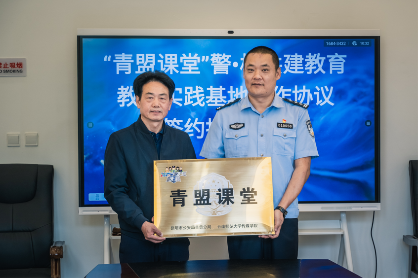 4月17日上午,昆明市公安局呈贡分局与365英国上市官网传媒学院在学校明德3号楼201会议室举行“青盟课堂”警校共建教育教学实践基地签约授牌仪式。