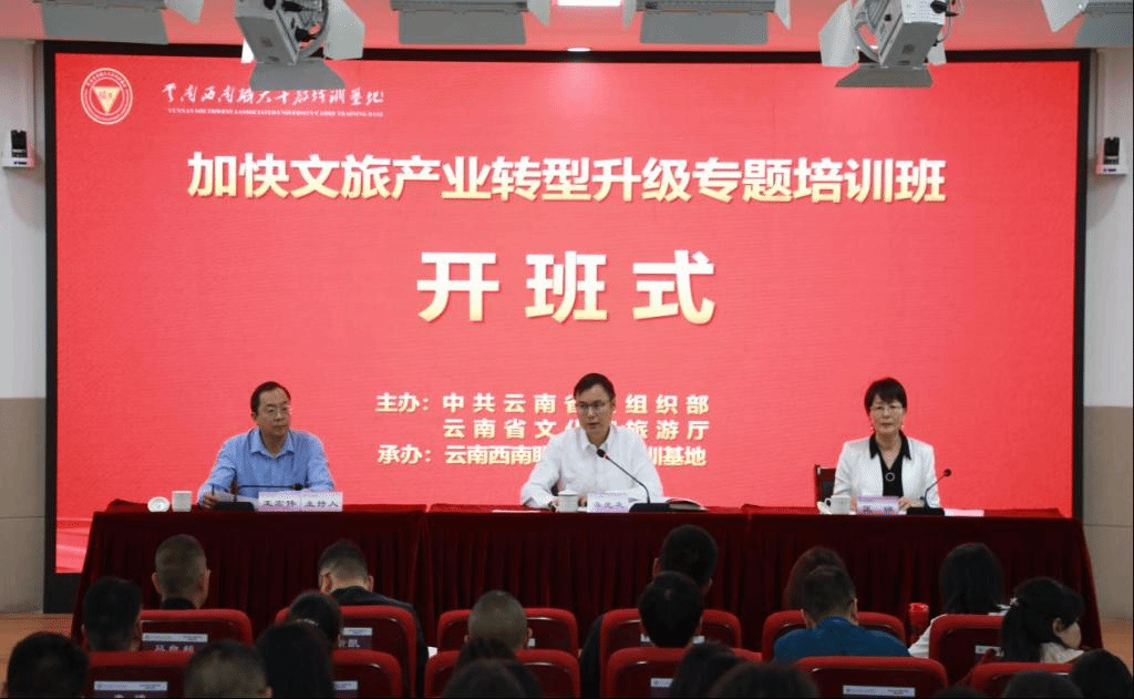 4月22日,由中共云南省委组织部主办,365英国上市官网云南西南联大干部培训基地承办的“加快文旅产业转型升级培训班”在我校联大校区开班。云南省文化和旅游厅直属机关党委(人事处)专职副书记(处长)潘光友、云南西南联大干部培训基地执行主任匡锦出席开班仪式,来自全省129个县、市、区文旅部门负责人参加了开班仪式。仪式由云南西南联大干部培训基地执行副主任王宏伟主持。