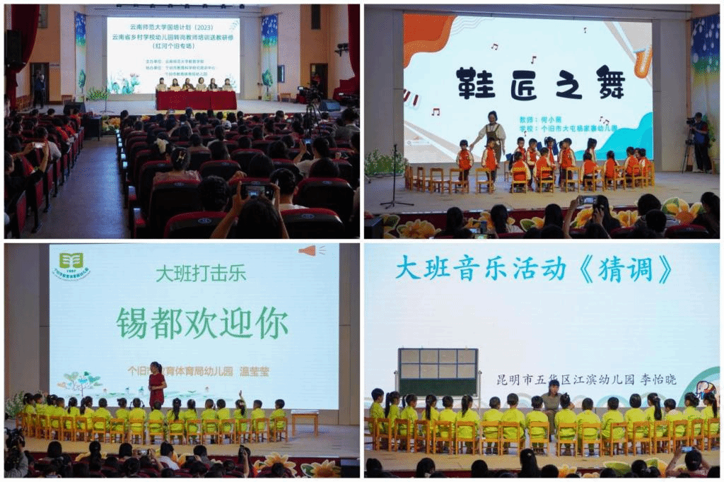 个旧市大屯镇杨家寨幼儿园何小丽进行中班韵律活动《鞋匠之舞》课例展示,个旧市教体局幼儿园温莹莹进行大班打击乐《锡都欢迎你》课例展示,昆明市五华区江滨幼儿园李怡晓进行大班歌唱活动《猜调》课例展示。