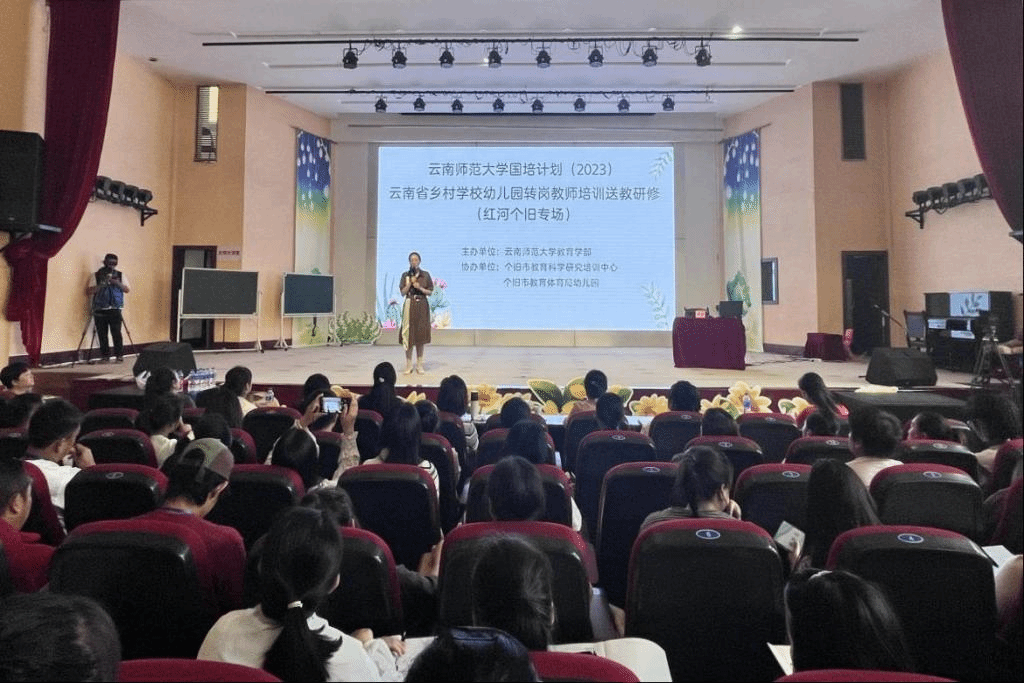 4月27日,国培计划(2023)云南省乡村学校幼儿园转岗教师培训送教研修(红河个旧专场)在个旧市教育体育局幼儿园小礼堂举行。本次活动采用线上线下相结合的方式进行,共分为课例展示、课例评析、专题讲座三个环节。来自红河州的50名转岗教师培训学员与个旧市246名公办、民办幼儿园教师共同参与了为期一天的线下研修活动。