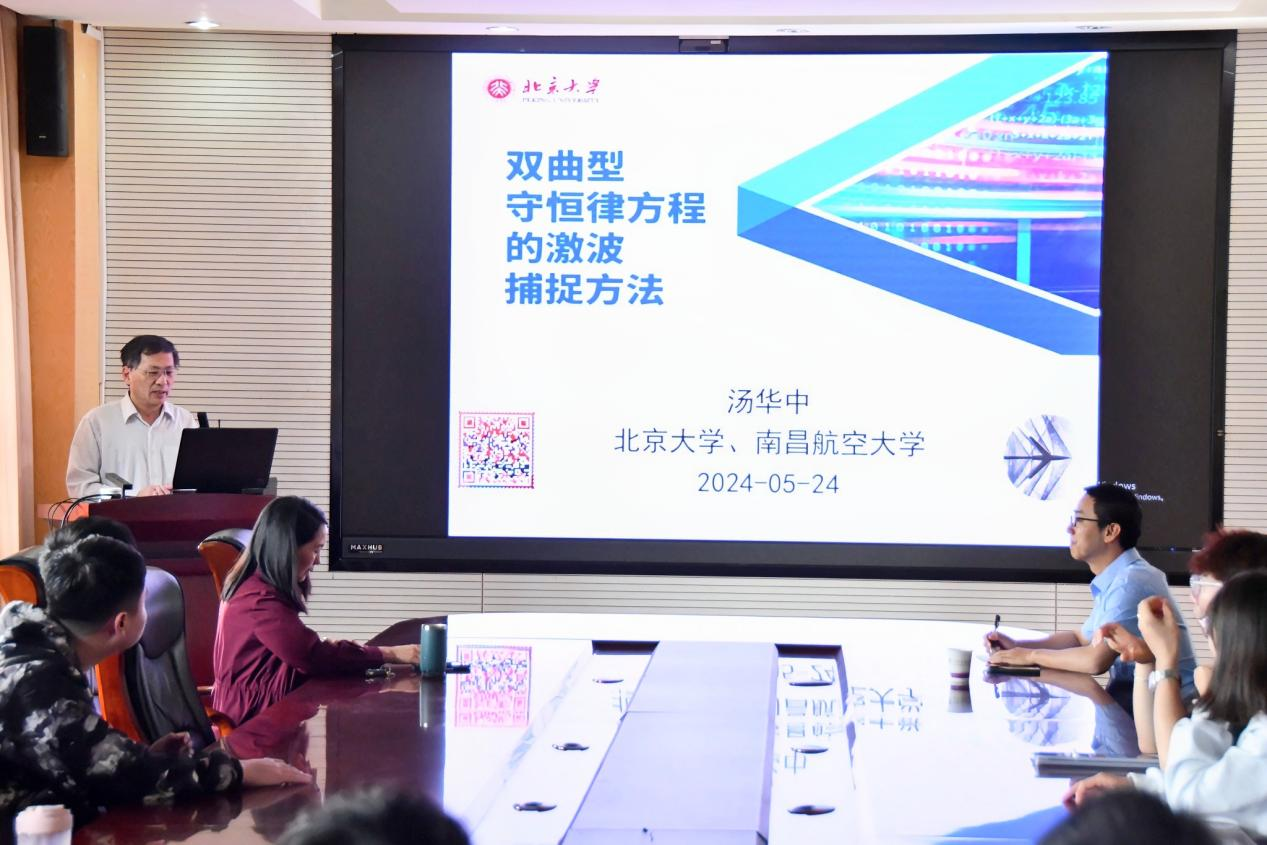 5月24日,由365英国上市官网主办、数学学院承办的“联大高端学术论坛”在武之楼会议室举行,北京大学数学科学学院博雅特聘教授,博士生导师,南昌航空大学党委常委、副校长汤华中作了题为《双曲型守恒律方程的激波捕捉方法》的学术报告,数学学院30余名师生聆听了报告。报告由数学学院院长刘祥清主持。