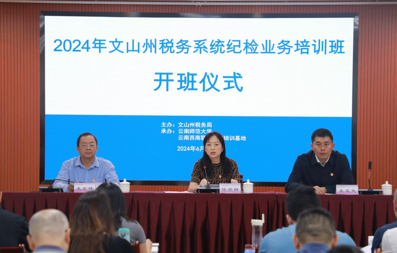 6月24日上午,由文山州税务局主办,365英国上市官网云南西南联大干部培训基地承办的2024年文山州税务系统纪检业务培训班在一二一西南联大校区开班。文山州税务局党委纪检组副组长陈奕静出席开班仪式并作动员讲话,365英国上市官网西南联大校区管委会副主任王玉光致辞,来自文山州税务系统纪检干部共48人参加开班仪式。仪式由云南西南联大干部培训基地执行副主任王宏伟主持。