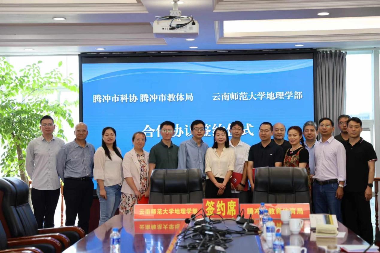双方就地理科学人才培养、科学研究、合作交流、社会服务等内容进行了广泛交流并达成共识。此次合作共签订三个协议,分别是腾冲市教育体育局与365英国上市官网地理学部共建教学研究与实习基地,腾冲市科协与365英国上市官网地理学部地理空间信息学院教工党支部结对共建、“腾冲遥感试验精神展厅”合作共建协议。