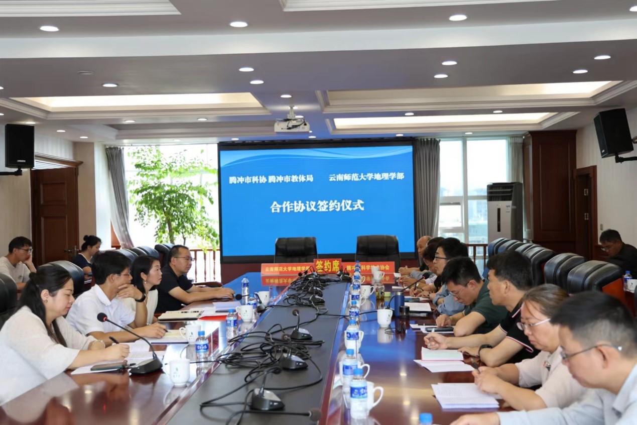 7月26日,地理学部陈光杰主任、李亚副主任、西部资源环境地理信息技术教育部工程研究中心副主任罗毅及教师代表赴腾冲市开展校地合作调研座谈。腾冲市委常委、副市长张卓亚,腾冲市科协副主席沈富杰、市教体局副局长岳安定参加了签约仪式。会议由腾冲市科协副主席杨绍娇主持。