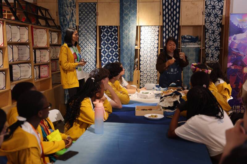 一个小时的现场体验给了黄依雯很多惊喜,那无法复制的纹理、静谧优雅的色彩、回归自然的拙趣,让她感受到了中国非遗的魅力。“用植物染出的蓝色太特别了,每一块布的图案也独一无二,我要把我今天的作品做成一个头巾,它一定很美。”