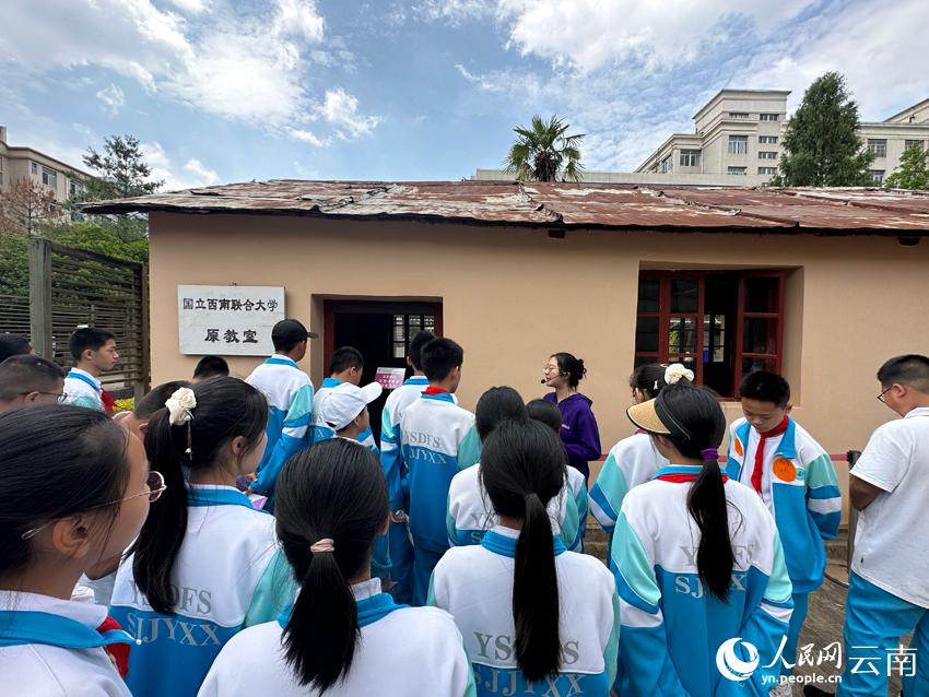 同学们在西南联大仿制门下聆听讲解。人民网 曾智慧摄