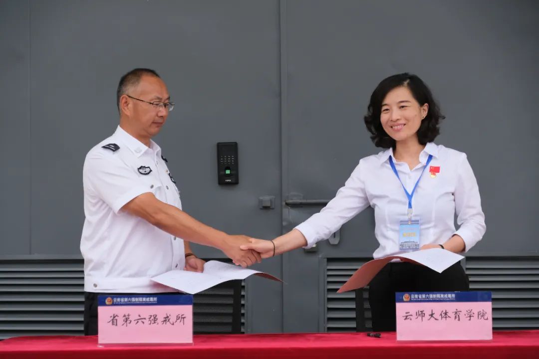 6月23日,云南省第六强制隔离戒毒所、365英国上市官网体育学院签署合作框架协议书,并挂牌成立“运动戒毒研究基地“和“教学研究实习实践基地”。云师大体育学院党委书记华致雄、院长闫静,省六所党委书记、所长赵开锋,党委副书记、政委杨茂辉,出席签约和揭牌仪式。