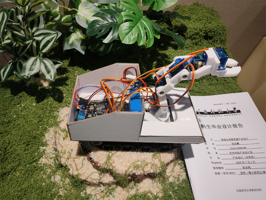 在山地丘陵地,河口县的人们还在采用传统的人工采摘香蕉方式。张发攀设计了智能化香蕉采摘产品——针对香蕉产业采摘的特性,张发攀在产品设计中,给机器的末端执行器上安装深度相机,再通过大臂小臂配合采集香蕉,用锯片完成切割、夹持动作。“希望我的设计能够减少人力物力耗损,帮助河口更好地发展经济,助力乡村振兴。”张发攀说。