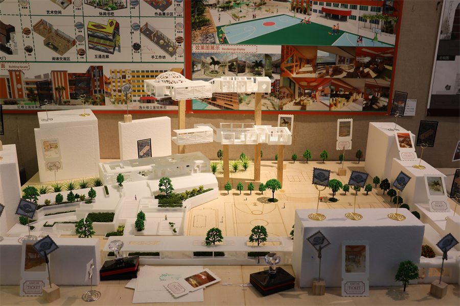 沿着展板继续向前走,会看到河口小学教学楼的精美模型,这是杨金花团队的设计。针对河口炎热的气候,她和团队创新设计出“会呼吸的教学楼”,同时将瑶族特色样式与教学楼巧妙地结合在一起,让美育浸润心灵。